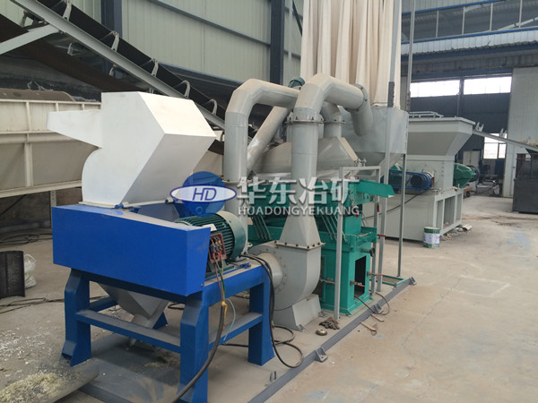 該型銅米機由粉碎機、輸送機、共振篩、離心風機、除塵器幾部分組成。物料由進料口進入粉碎機,粉碎后的物料由輸送機送到共振篩,在共振篩風機的共同作用下銅和塑料分離開由兩端分別流出,灰塵雜質由風機送到除塵器中集中起來。